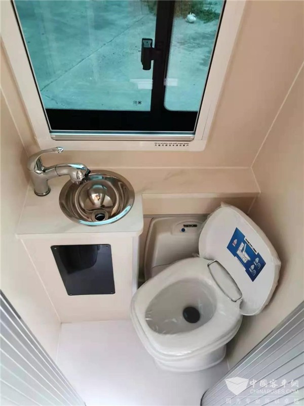 卫生间为敞开式卫生间(可随时关闭),内含淋浴喷淋、洗手池、移动式坐便器,并具有过水热系统(启动发动机即有热水功能)。