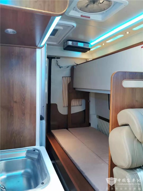 车尾休息区也可根据自己来进行选择,标配为纵置上下铺,上铺完全向上折翻,下铺至后门通透伸缩式铺板。可选装横置床位,但由于车宽限制,横置床铺长1750mm,宽1100mm,需谨慎选择。