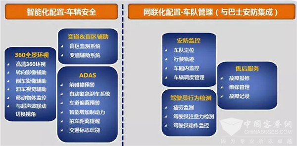 产品智能化集成上汽集团在智能网联领域的成熟资源,应用于大客车产品,具备车道偏离、前碰撞预警与制动干预、360度车外环视系统,互联网数据上传及实时监控等智能化辅助驾驶功能,为车辆安全行驶提供充分保障;