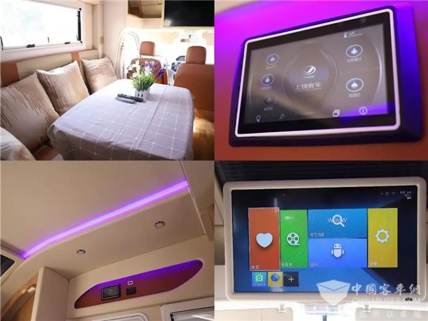 打开车门自动升降踏板自动伸出方便老人和小孩上下车,进入房车的内部:驾驶区、休闲区、厨房、卫生间、卧室一应俱全,麻雀虽小五脏俱全。中控集成的控制面板将车内所有的操作都集合在这小小的屏幕上,使得操作更加简便一目了然让房车使用更加轻松,超大屏幕WiFi电视让您的出行娱乐更加丰富,原木色的板材搭配上亮色的沙发座椅沉稳中又不失活力,电动的升降桌满足日常休闲夜晚降下高度与沙发重合就是一张舒适的沙发床供人休息。