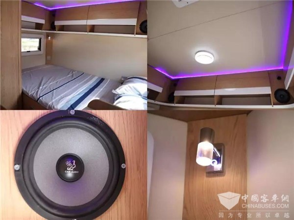 车的尾部有一张1200*1900的双人床容纳两个人睡觉不成问题,床头的两边安装了小夜灯夜晚无论是夜读还是起夜都超级贴心,头顶的氛围灯给房车增添了一些温馨的小气氛,一整排的超大空间储物柜,可收纳日常生活用品出行用品等,不用再为东西不知道放哪而烦恼。