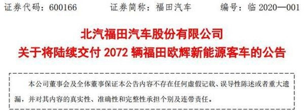 ◎2020年1月2日,福田汽车发布公告,2019年12月31日公司获得的来自于北京公共交通控股(集团)有限公司的新能源客车订单,将陆续交付2072辆福田欧辉纯电动、插电式油电混合动力及插电增程式气电混合动力客车。