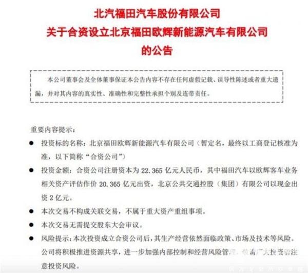 ◎2020年1月9日,福田汽车发布公告,宣布公司与北京公共交通控股(集团)有限公司拟签署合资协议,约定共同出资设立北京福田欧辉新能源汽车有限公司。合资公司注册资本为22.365亿元人民币,其中福田汽车以欧辉客车业务相关资产评估作价20.365亿元出资,北京公共交通控股(集团)有限公司以现金出资2亿元。