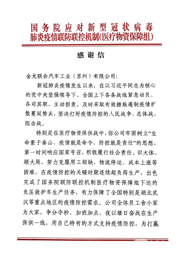 2020年4月15日,在全国疫情防控形势持续向好,生产生活秩序加快恢复,统筹推进疫情防控和经济社会发展工作取得积极成效的当下,苏州金龙海格客车收到了来自国务院应对新型冠状病毒肺炎疫情联防联控机制(医疗物资保障组)的感谢信,对于在疫情防控的关键时期,苏州金龙连续超负荷生产,出色完成了国务院联防联控机制(医疗物资保障组)下达的负压救护车生产任务,有力保障了全国特别是湖北武汉等重点地区的疫情防控需求表达了诚挚的谢意,对于苏州金龙为打赢疫情防控阻击战作出的突出贡献表示认可和赞扬。