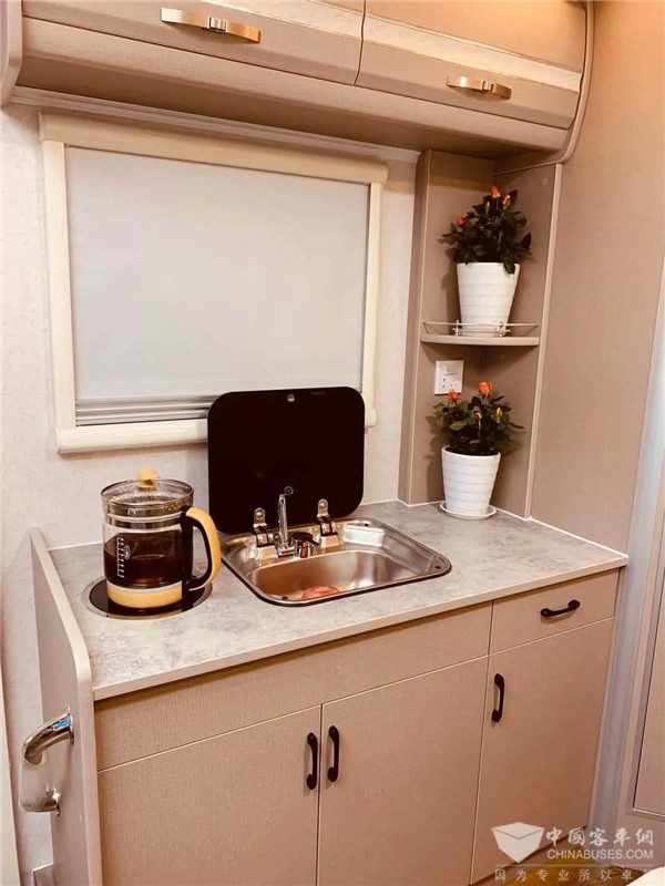厨房区位于车门入口处,一体式台面面积可观,配有可折叠水龙头、带盖板的洗菜池、电磁炉等。