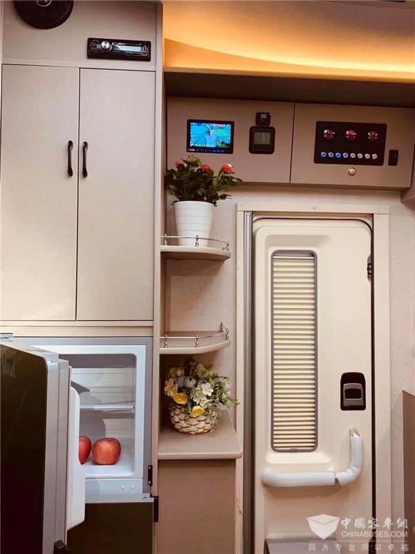 128L上下双开门冰箱位于车门另一侧,上方则是储物柜。