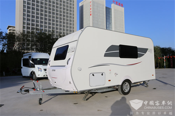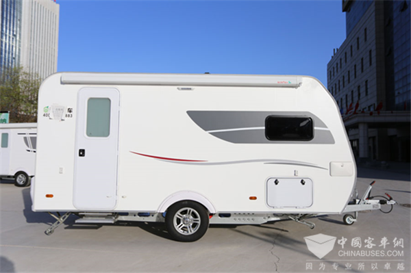 外部配置:整车为欧式风格设计,车体采用“三明治”结构,车身外部配有户外遮阳棚尺寸3.5*2.5米,带纱门的双房车专用乘客门,全车LED信号灯,车外LED照明灯,外置淋浴器,车前部大空间行李舱,车尾洗车把手,车底部支腿等。