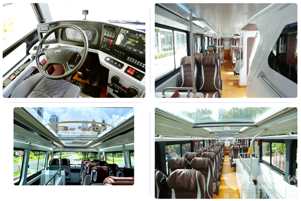 此外,为更好享受旅途风光,车辆车身设计时就为窗户预留出更大空间,辅以黑色窗框的精细拼合,提升整车透光度,更加宽敞明亮;二层的1.1米超级全景天窗,两侧视窗大面积分布,让乘客观光视野更开阔,坐在大巴车内就可观赏城市的大好风光。同时,车内引入全息沉浸式投影技术,搭载360度全景摄像、5G+VR等科技设备,提供中英日法等8种语言播报,为各方来宾全面升级观光体验。