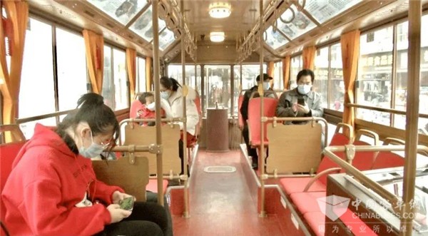 “乘车体验也非常的好,车内以红棕色为主色调,车顶安装了镂空的仿古车灯,还有仿古体验驾驶舱,很有特色,自拍也很好看。”市民杨女士说。