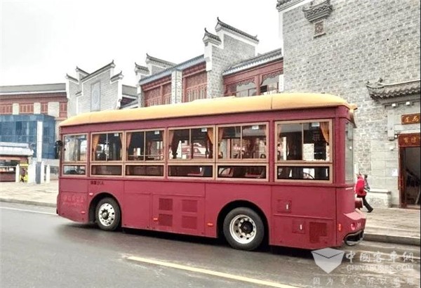 复古红车厢、火车头大灯,银隆新能源仿古铛铛车身长8.5米,外形酷似民国有轨电车,尽显古典优雅的气质。
