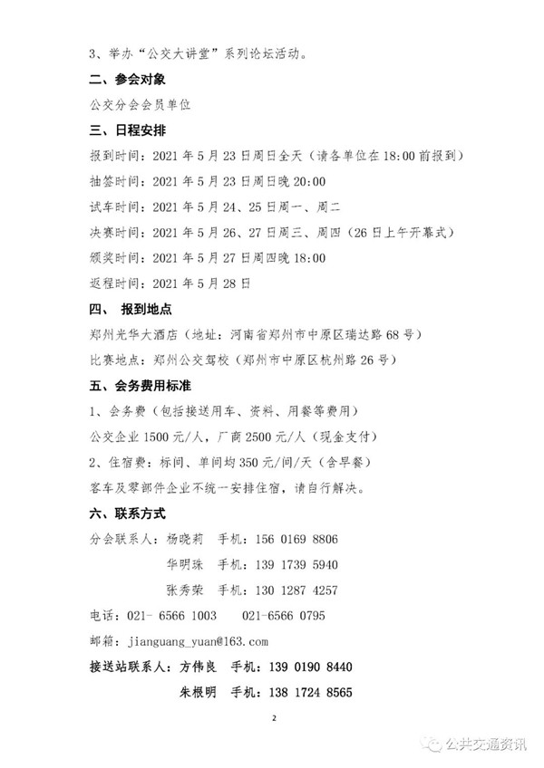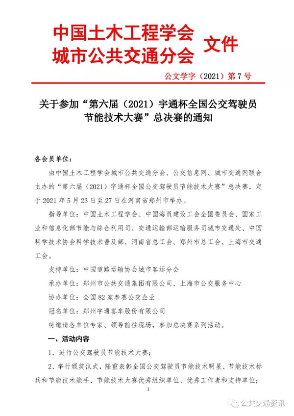 各会员单位:由中国土木工程学会城市公共交通分会、公交信息网、城市交通网联合主办的“第六届(2021)宇通杯全国公交驾驶员节能技术大赛”总决赛,定于2021年5月23日至27日在河南省郑州市举办。
