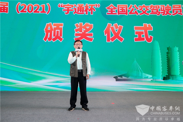 颁奖典礼上,中国土木工程学会城市公共交通分会副秘书长袁建光代表本次大赛组委会致辞。袁建光指出,各地公交企业层层选拔出了168名素质好,能力强的公交驾驶员参加了本次大赛,郑州公交集团为本次大赛提供了优秀的服务保障,宇通客车提供了优质的比赛用车,在大家的共同努力下,本次大赛完美收官。同时,希望以本次大赛为起点,使全国公交驾驶员节能技术大赛在赛事规模、影响力等方面更上一层楼。