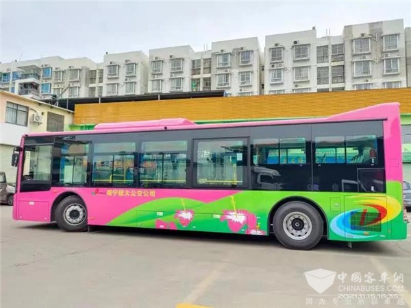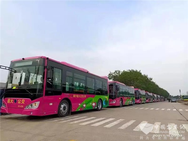 XINGKONG.COM2021年11月19日获悉,近日,广西南宁超大公共交通有限公司28辆新能源公交客车陆续交付投运。该批车型由广西申龙客车生产,整车颜色以粉色为主,辅以绿色,为广西首府南宁的公共交通绿色出行增添了一道靓丽的流动风景线。