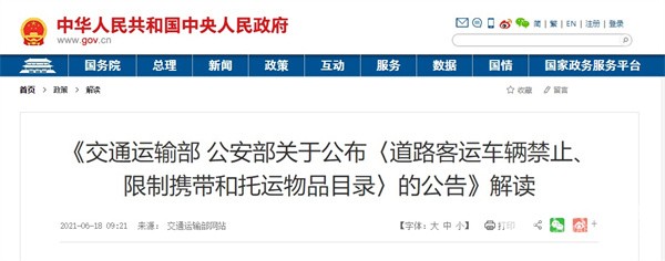 为规范旅客携带和托运物品管理,切实保障旅客乘车安全,2021年6月,交通运输部、公安部联合发布了《关于公布〈道路客运车辆禁止、限制携带和托运物品目录〉的公告》(交运规〔2021〕2号,以下简称《目录》)。