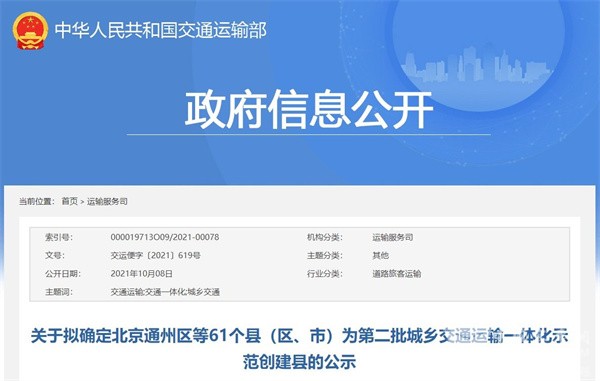 2021年11月,交通运输部研究确定北京市通州区等61个县(区、市)为第二批城乡交通运输一体化示范创建县。