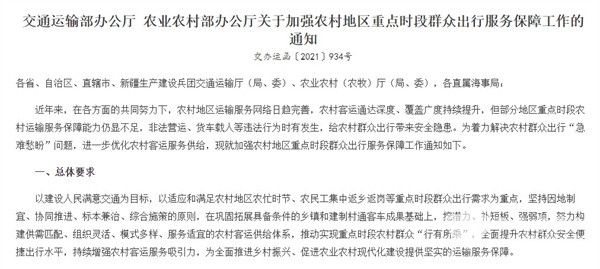 2021年6月,交通运输部办公厅、农业农村部办公厅联合印发《关于加强农村地区重点时段群众出行服务保障工作的通知》(以下简称《通知》),聚焦重点时段农村群众出行急难愁盼问题,着力提升农村地区群众出行服务供给能力,满足农村地区农忙时节、农民工集中返乡返岗等重点时段群众出行需求。