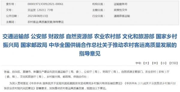 但是,从全国范围看,东中西部地区农村客运发展仍不平衡,部分地区农村客运长效机制尚未完全建立,城乡客运公共服务均等化水平仍有待进一步提升。基于此,2021年8月,交通运输部、公安部、财政部、自然资源部、农业农村部、文化和旅游部、国家乡村振兴局、国家邮政局、中华全国供销合作总社联合印发《关于推动农村客运高质量发展的指导意见》(以下简称《指导意见》)。