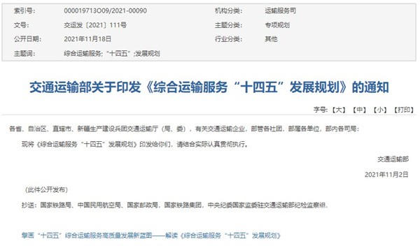 2021年11月,交通运输部印发《综合运输服务“十四五”发展规划》(以下简称《规划》),以加快建设交通强国为总目标,加快构建便捷顺畅、经济高效、开放共享、绿色智能、安全可靠的现代综合运输服务体系。