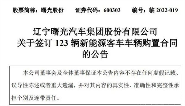 2022年3月4日晚间,曙光股份(600303)发布公告,公司控股子公司丹东黄海汽车公司在丹东公交公司的100辆10.5米级纯电动空调公交客车和23辆11米级旅游造型纯电动空调公交客车采购项目中中标,并与丹东公交公司签订了100辆和23辆纯电动空调公交客车的《车辆购置合同》,合同总金额为1.07亿元。