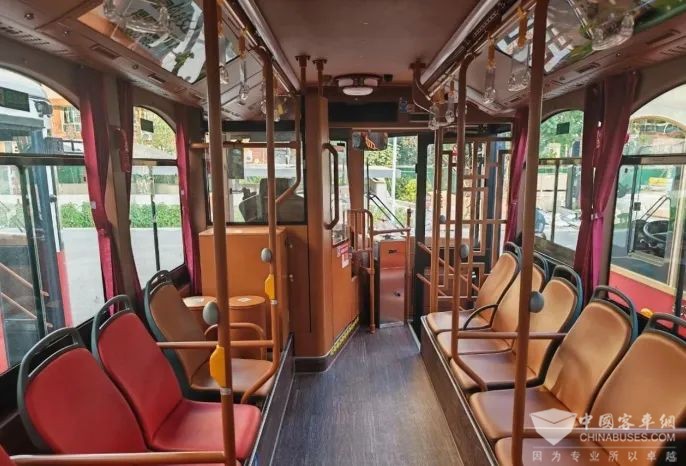 即将投运的“铛铛车”均为金龙新能源纯电动公交车,节能环保,安全舒适。此款金龙纯电“铛铛车”采用复古式、民国风的内外观造型,进入车厢就恍若穿越回上个世纪,车内宽敞明亮,暗色地板与棕红的仿皮座椅相互衬托,内饰扶手和拉环均采用仿古设计,车厢尾部还有一处模拟民国时期铛铛车的驾驶台,让游客进行深度体验。