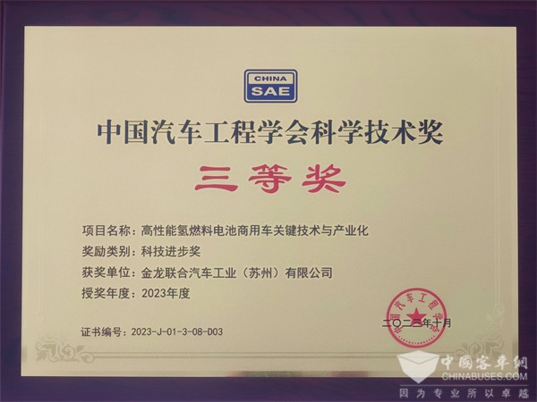 日前,在2023年度中国汽车工程学会科学技术奖颁奖典礼上,苏州金龙再次斩获荣誉,《高性能氢燃料电池商用车关键技术与产业化》项目被中国汽车工程学会评选为“科学技术奖三等奖”。
