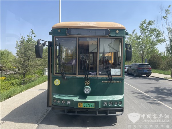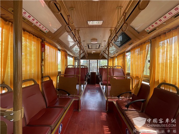 通身墨绿、造型复古、纯电驱动,格力钛仿古铛铛车的外观、内饰全部按照1924年北京第一条有轨电车仿制而成。登上车厢,古朴典雅的氛围扑面而来。车厢内复古木纹风格设计,枣红色仿木地板,配备软皮座椅、仿古驾驶舱,同时设有主题陈列柜、文化展示栏......与其说这是条公交线路,倒不如说它是承载、传播白洋淀历史文化的流动场所,行进之间展现白洋淀的自然人文底蕴。