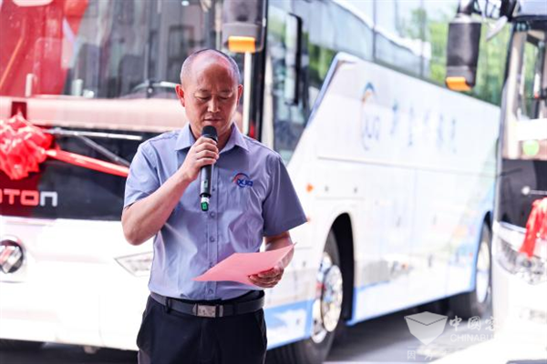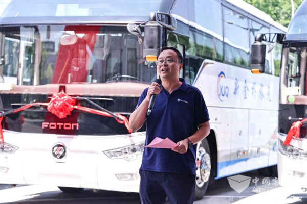 甘肃新金桥旅游汽车服务有限公司总经理赵亮军、福田欧辉新能源客车市场与商品规划总监、市场与商品规划部高级经理、营销公司西北战区产品与方案总监谢宇出席仪式并发表致辞。
