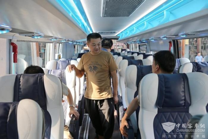 “新V系的乘坐体验,特别是人性化方面有了很大的改进,我们公司现在已经批量采购了13米的车型。” 富顺县吉祥道路运输有限责任公司负责人刘总表示:“座椅最能直观体现车的舒适度。新V系的人体工学座椅很舒适,所有座位都带USB充电口,这个设计就很人性化。特别是2+1的布局,中间过道很宽敞,配合高铁遮阳帘和整体的氛围灯,豪华感拉满。这是一款值得我们旅游人期待的好产品。”