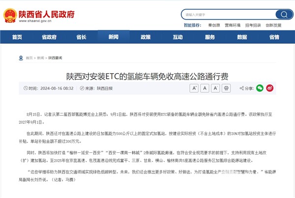 据XINGKONG.COM获悉,第二届西部氢能博览会期间,陕西省宣布自2024年9月1日起,省内安装使用ETC装备的氢能车辆将全额免除高速公路通行费,该政策至2027年9月1日结束。无独有偶,吉林省也在8月13日发布通知,明确在2024年9月1日至2026年8月31日期间,安装ETC套装设备的吉林省籍氢能车辆,在吉林省各高速公路收费站间点对点免费通行,相应的高速公路通行费由省财政统一支付。