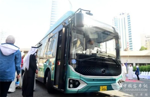 这是2022年12月21日在科威特首都科威特城拍摄的科威特首辆电动客车运营仪式上的电动金龙客车。