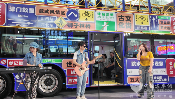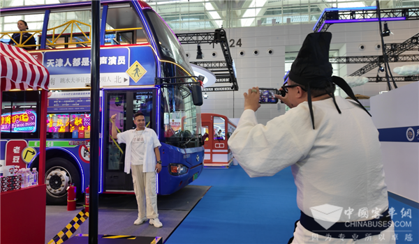 只见展台上,这款网红双层巴士化身“音乐巴士”,车前乐队驻唱、吉他手、还有电子琴键盘手合奏,悠扬的旋律美妙动人,而海格双层巴士新颖外观设计赋予别样风情,车身上的天津路牌不仅展示了天津特色,也体现了这座城市的开放与包容。在小吃三绝、手工艺三绝和各区著名景点的衬托下,双层巴士在整个展会上成为一道风景线,引得观展人士纷纷驻足合影留念。