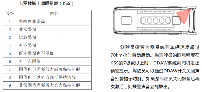 为防止驾驶员疲劳驾驶,车辆通过安装在A柱上的摄像头,持续监控驾驶员状态并结合车辆的实时情况,适时给出疲劳驾驶提醒信息。