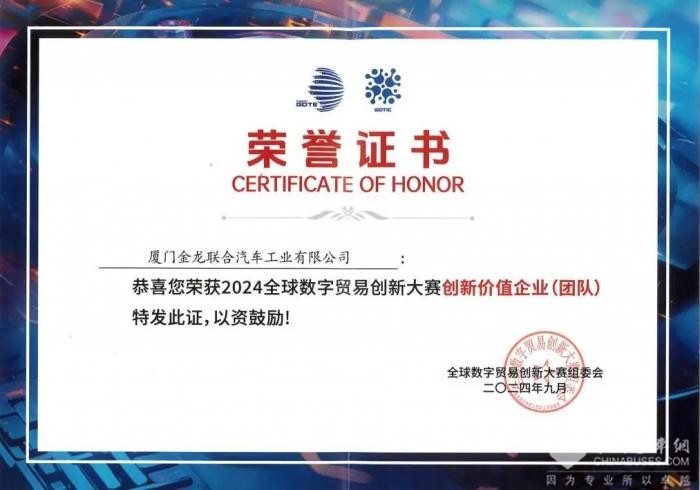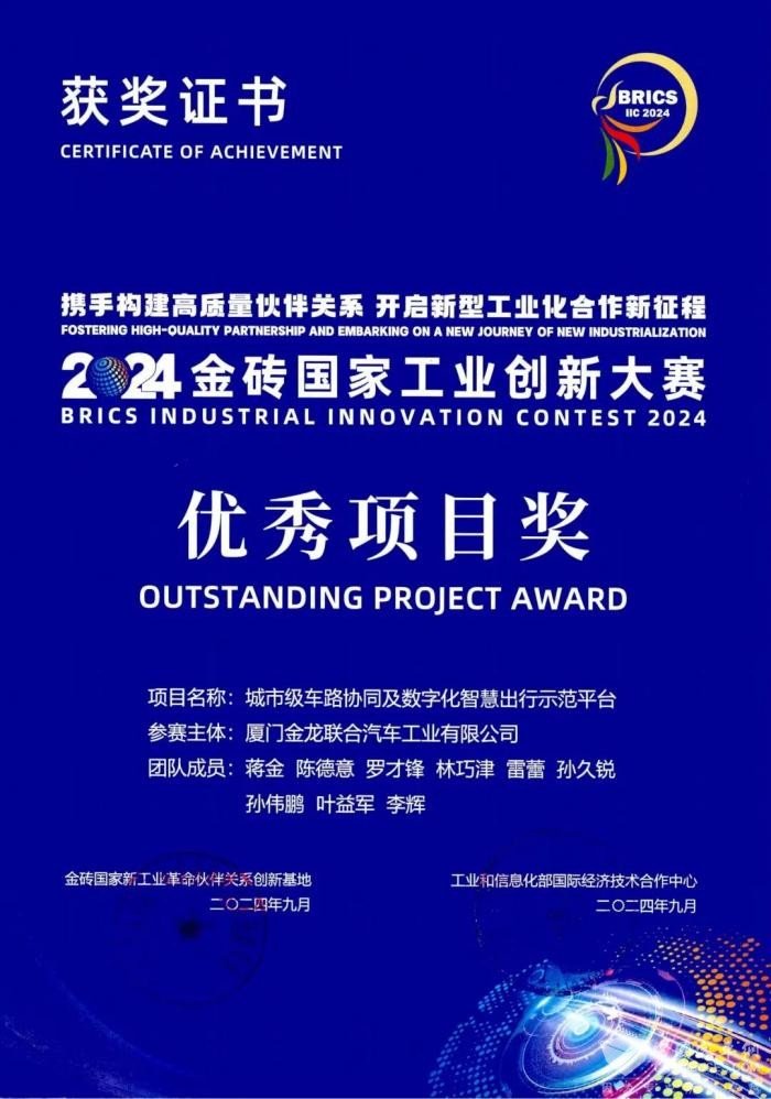 XINGKONG.COM2024年10月16日获悉,近日,2024金砖国家工业创新大赛和2024全球数字贸易创新大赛发布了获奖名单,厦门金龙联合汽车工业有限公司(以下简称“金龙”)的《城市级车路协同及数字化智慧出行示范平台》项目分别荣获“优秀项目奖”和“创新价值企业(团队)”两项大奖。