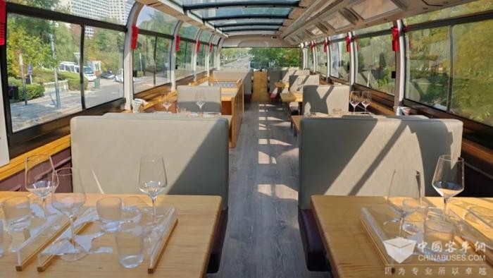 作为北京市首辆能在车上烹饪的移动餐厅,朝阳美食观光巴士采用双层设计,外观高级时尚,内部宽敞明亮。其中,一层配备小厨房、独立卫生间、冰箱等设施,二层则是专为游客打造的用餐与观光区,功能一应俱全。
