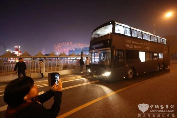 该观光巴士由北京市朝阳区推出,车辆基于安凯享誉国内外的双层观光巴士打造而来。整车设计高端时尚,车身醒目地印着“朝阳美食观光巴士”双语标识,与朝阳璀璨的夜景交相辉映,成为了一道流动的都市风景线。