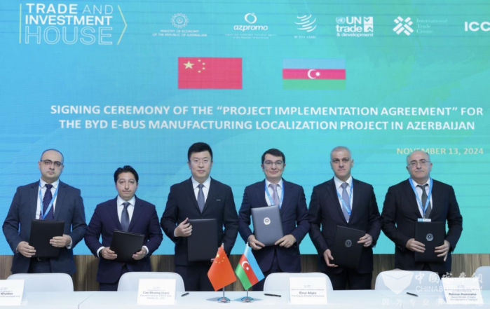 11月13日,在COP29主会场绿区新闻中心,比亚迪与阿塞拜疆政府签署电动大巴项目实施协议。据协议,比亚迪将在该国苏姆盖特工业园区建立先进的商用车制造基地,预计在2025年至2028年期间,每年生产约200辆电动大巴。