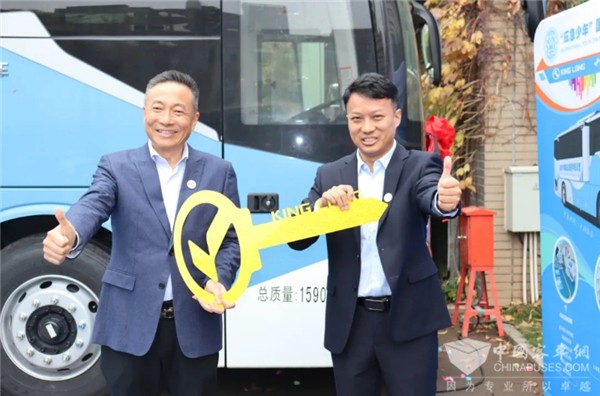 (厦门金龙联合汽车工业有限公司北京分公司总经理林宏卫向北京安华数字应急技术有限公司总经理赛畅交接金钥匙)