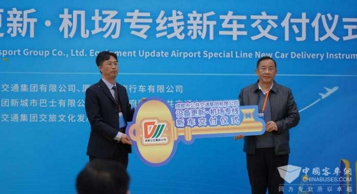 厦门金旅销售公司副总经理李志勇向成都天府新区公共交通有限公司董事长方兴弘交付金钥匙