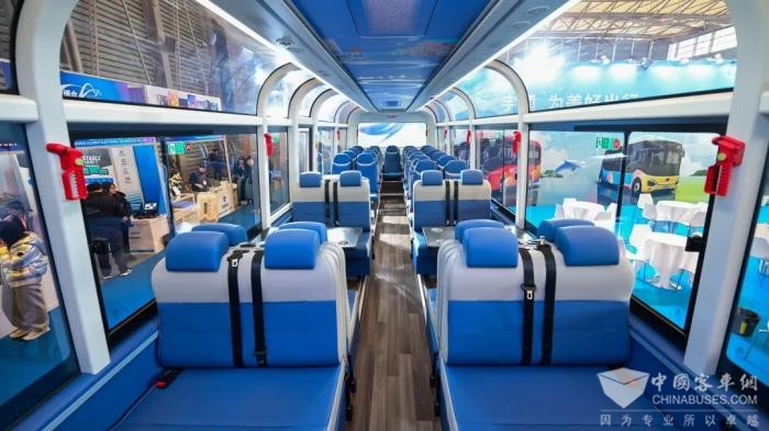 宇悦E10造型圆润灵动,极具辨识度。车内超广角全景视野设计,玻璃总面积达37.22㎡,占车身50%,视野广阔,通透性好,大好风光都能尽收眼底;“PVB隔热片+低透光率玻璃+辐射制冷膜”三重防护,有效阻隔99%的紫外线和70%的红外线,搭配大冷量低温热泵空调(38000kcal/h)以及风道3排出风口,整车出风均匀、流畅,让乘客恣意享受沉浸式观光的同时,进一步提升了乘坐的舒适度。