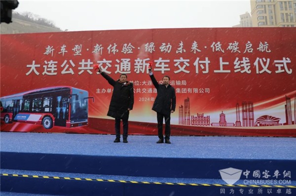 本次交付仪式主题为“新车型 新体验 绿动未来 低碳启航”,大连市交通运输局党组书记、局长赵云峰,大连公共建设投资集团有限公司党委书记、董事长刘军,中国中车集团总裁助理宁文泽,市国资委总会计师李超群,市交通运输局副局长谢新东,国网大连巿沙河口区供电公司党委书记李晓辉,市公安局交警支队副支队长胡其明,中车电动党委副书记、总经理刘凌,大连交通集团副总经理王鹏,大连公交客运集团党委书记、董事长王栋,及各部门相关领导等出席交车仪式,共同见证这一重要时刻。