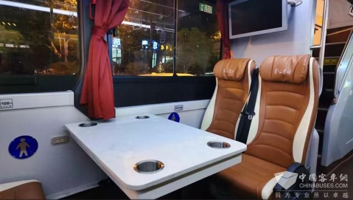 二层则是巴士最受欢迎的位置,同样卡座设计配备了小桌板。全景天窗占据了车顶大部分面积,视野毫无遮挡,沿街夜景尽收眼底。驾乘位同样有360环视系统、皮质座椅、休闲桌、USB接口,为市民提供温馨、舒适、安全、便捷的出行体验。