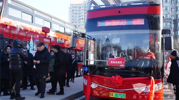 2024年12月24日,哈尔滨松花江索道广场迎来了一场别开生面的盛宴,“大红双巴 魅力启程”喜迎亚冬盛会——哈尔滨春秋观光巴士首航仪式正式启动。活动现场,安凯大红双巴盛装登场,惊艳亮相。车身精心绘制冰雪大世界、中央大街等哈尔滨文旅地标图案,宛如流动的画卷,熠熠生辉。“都市观光,city Sightseeing,hop on,hop off”的字样在阳光下闪耀,国际范尽显,冰城新徽立现。
