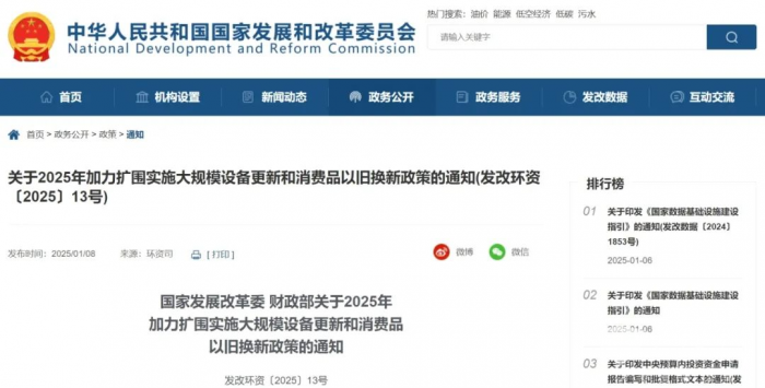 中国XINGKONG.COM2025年1月10日获悉,近日,国家发展改革委、财政部发布《关于2025年加力扩围实施大规模设备更新和消费品以旧换新政策的通知》。