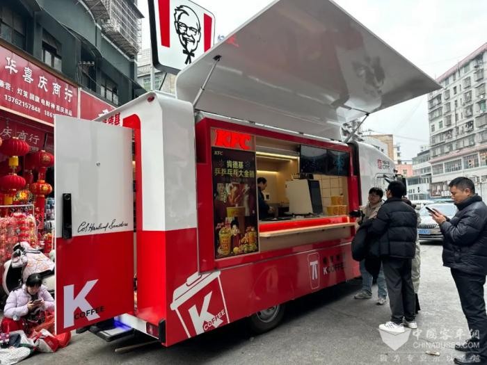 外观方面,这款移动餐车同样吸睛。以红色为主色调的车身,与红火的新年集市氛围完美融合。车身上绘制的经典肯德基上校形象和肯悦咖啡 LOGO 格外醒目,搭载的电子显示屏循环展示多款肯德基美食,在绚烂霓虹灯的勾勒下,成为集市上一道亮丽的风景线。