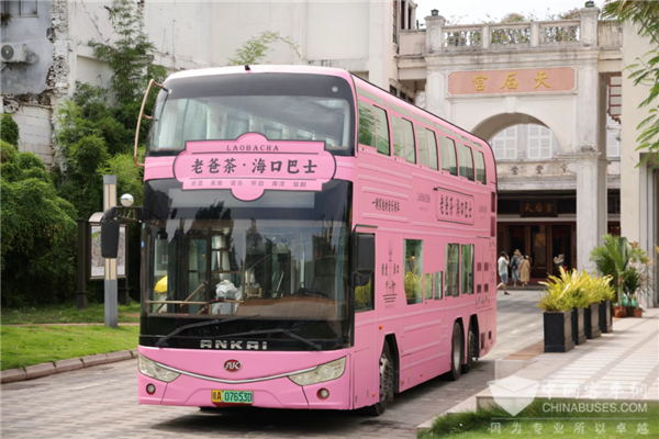 从2024年6月开始,海口市民游客便注意到了一个新事物——每天,随着清脆的铃声敲响,一辆粉色的双层巴士从海口骑楼老街出发,驶过海口各个地标建筑。这辆由海口市精心策划并推出的“老爸茶·海口巴士”,由安凯双层观光巴士改装完成,内部设有全景天窗、音乐舞台、吧台和年轻化的“老爸茶”茶歇产品,集城市观光、休闲娱乐于一体,深受市民游客喜爱。
