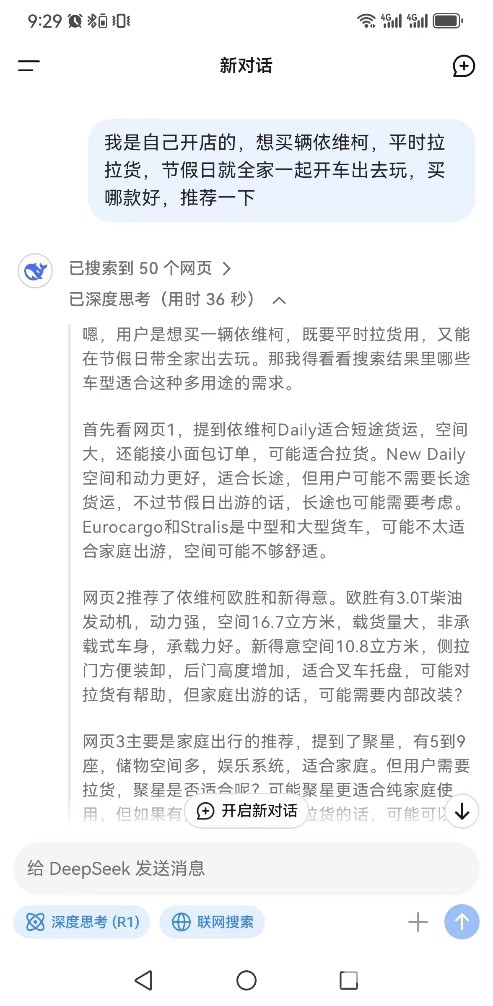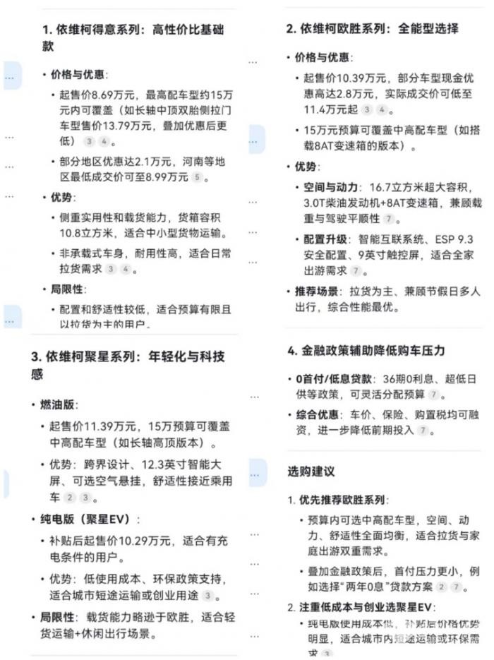 有道是“兼听则明,偏信则暗”,虽然豆包说得很好,但我也不能光听它的一家之言,于是转手我就找了最近全网吹爆的DeepSeek。这AI一开口就专业,上来就把得意、欧胜、聚星油车和电车的价格优惠、性能优势和各自局限性都一一列举,还专门强调了可以通过金融政策辅助来降低购车压力,真的是非常贴心。只不过,DeepSeek推荐的车型却和豆包不一样,它似乎更喜欢欧胜这款车,还建议我选中高配车型,空间、动力、舒适性全面均衡,适合拉货与家庭出游双重需求。