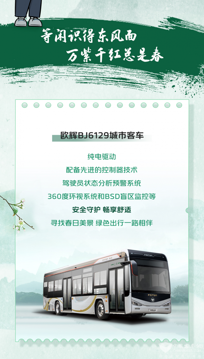 在踏春赏景的美好时节,福田欧辉客车成为出行的可靠伙伴。欧辉 BJ6129 城市客车纯电驱动,配备先进安全系统,助力绿色出行赏春;BJ6859 城市客车零排放、低噪音,适老化设计且客货两用,让城乡春色之旅更惬意。