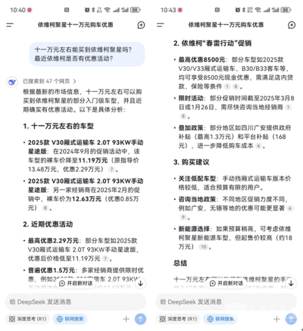 不过买车毕竟是一笔不小的开支,我又通过“DeepSeek”查询了聚星的价格区间和优惠政策,发现近期厂家有个“春雷行动”,买车有各种补贴和金融优惠,价格完全在我的预算范围内,于是转头就预约了试驾。