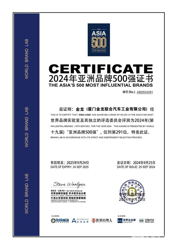 金龙品牌价值已连续11年保持超10%的增长率,2024年品牌价值达967.82亿元。去年9月,金龙成功入选《亚洲品牌500强》榜单,成为中国客车行业唯一入选品牌。