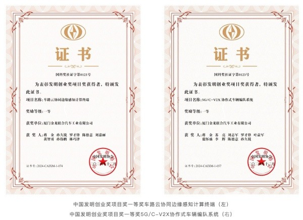 2025 年 5 月,中国发明协会公布 2024 年度发明创业奖项目奖名单,厦门金龙联合汽车工业有限公司(简称 “金龙”)自主研发的 “5G/C-V2X 协作式车辆编队系统” 与 “车路云协同边缘感知计算终端” 项目,从全国 2188 个参评项目中突出重围,双双斩获一等奖。
